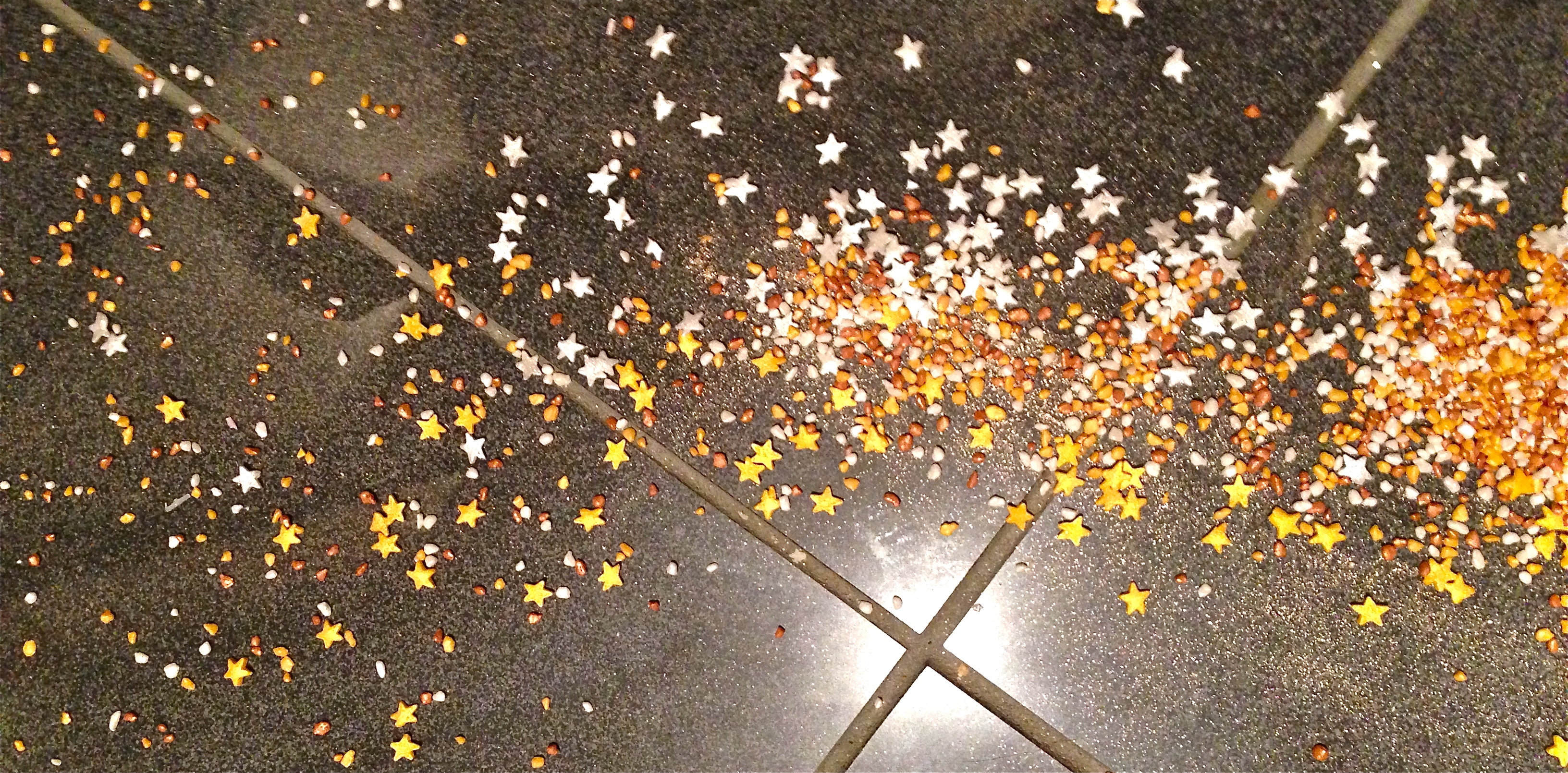 By the way, the above photo is what happens when you have a full container of sprinkles on your kitchen counter top, and you inadvertently knock said container off the counter. Makes a pretty loud bang too!