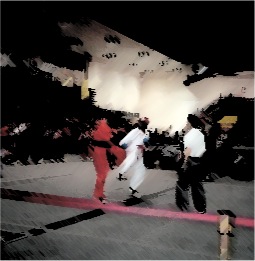 The other fighter stays in close. She’s older and more experienced, recognising that her opponent will want to use her legs and superior reach to gain points. So she cuts her off, jamming up her kicks before they can land, reaching over and under and around so all the other fighter can do is block, arms working frantically, elbows in tight, impact hard against her ribs. She will be bruised, later, but for now she barely feels a thing.