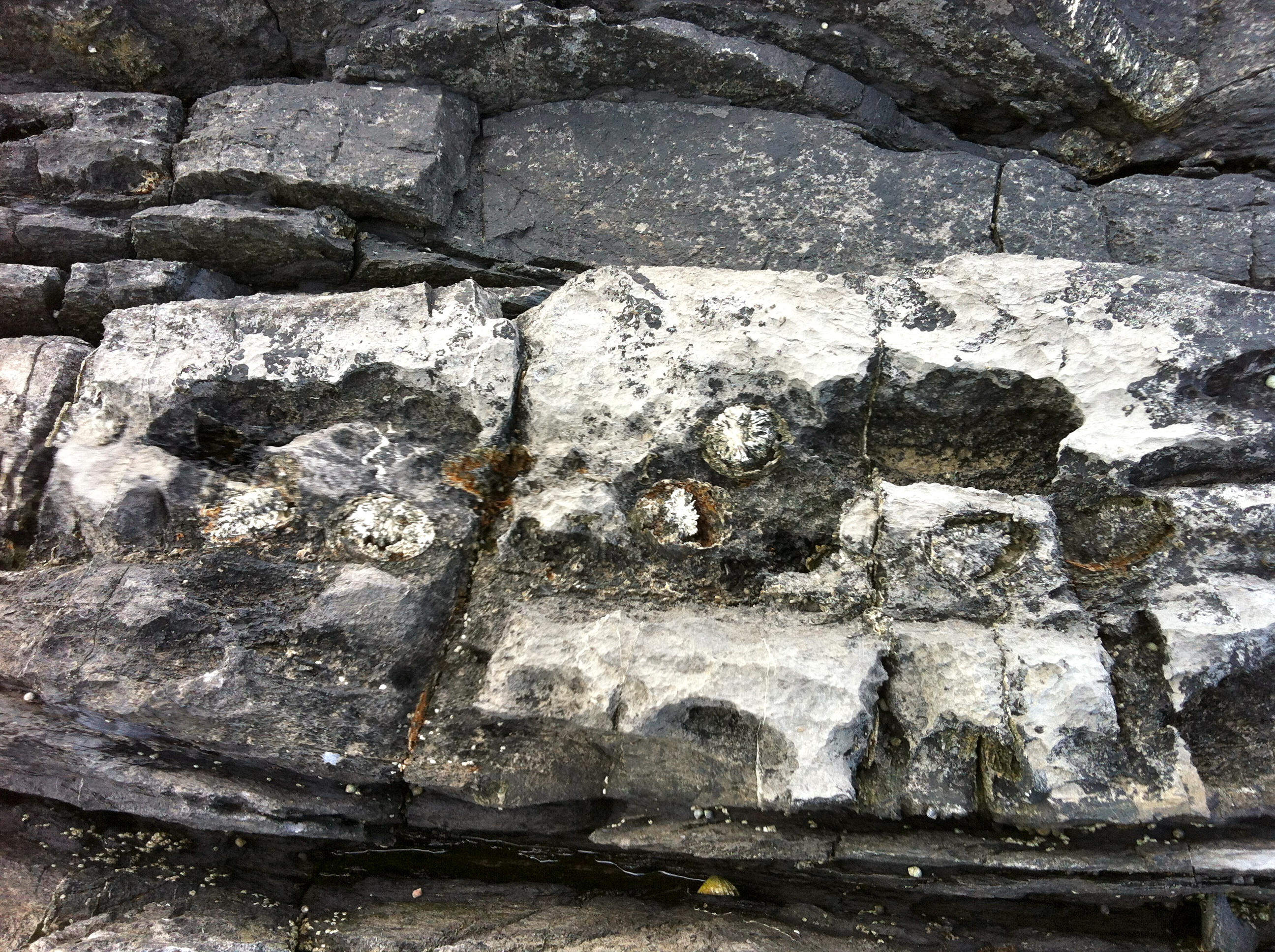 I’ve written about this object before. We found it on a beach in Ireland, just a little way around from where I photographed my rock face. We’d decided to climb along the rocks at the water’s edge to a small cove we could see in the distance. It turned out to be a fairly challenging undertaking, especially with a seven-year-old in tow, as the rocks became quite steep, deep pools of clear sea water just below our feet. But what amazing rocks they were! Full of fossils and layered and stacked, lines of colour showing how the landscape had built up over millennia.