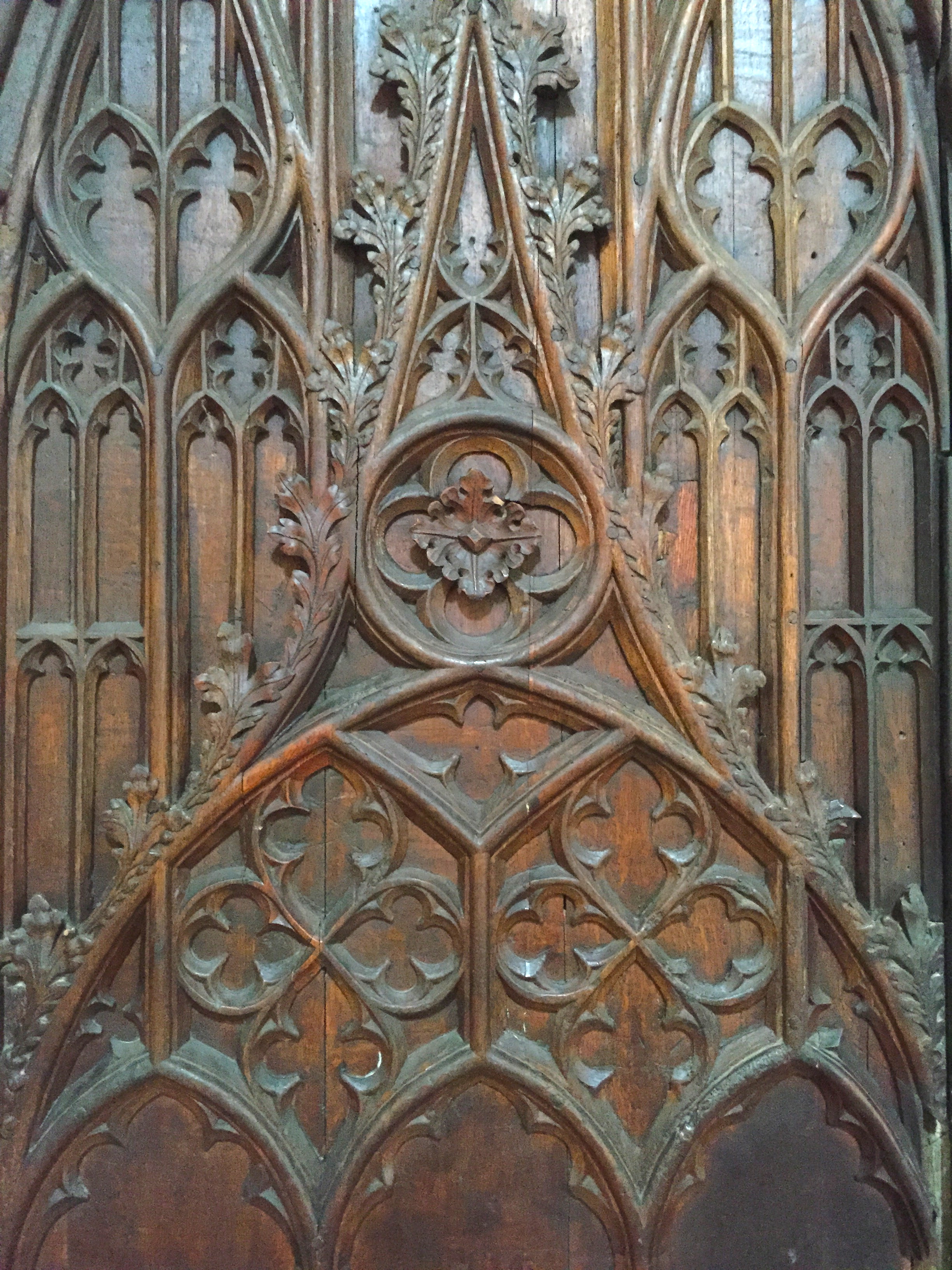 Also in St Albans Cathedral, the Bishop’s Door is thought to have been made around 1396, and the Great West Doors I featured previously, made around 1420-40, were based on the design of this earlier door. On the top right-hand side of the doorframe is the crest of St Albans, and on the other side the crest of Richard II, king at the time the doors were made. The timber has been well maintained over the years, so is in better condition than the Great West Doors, and the quality of the carving is just beautiful.