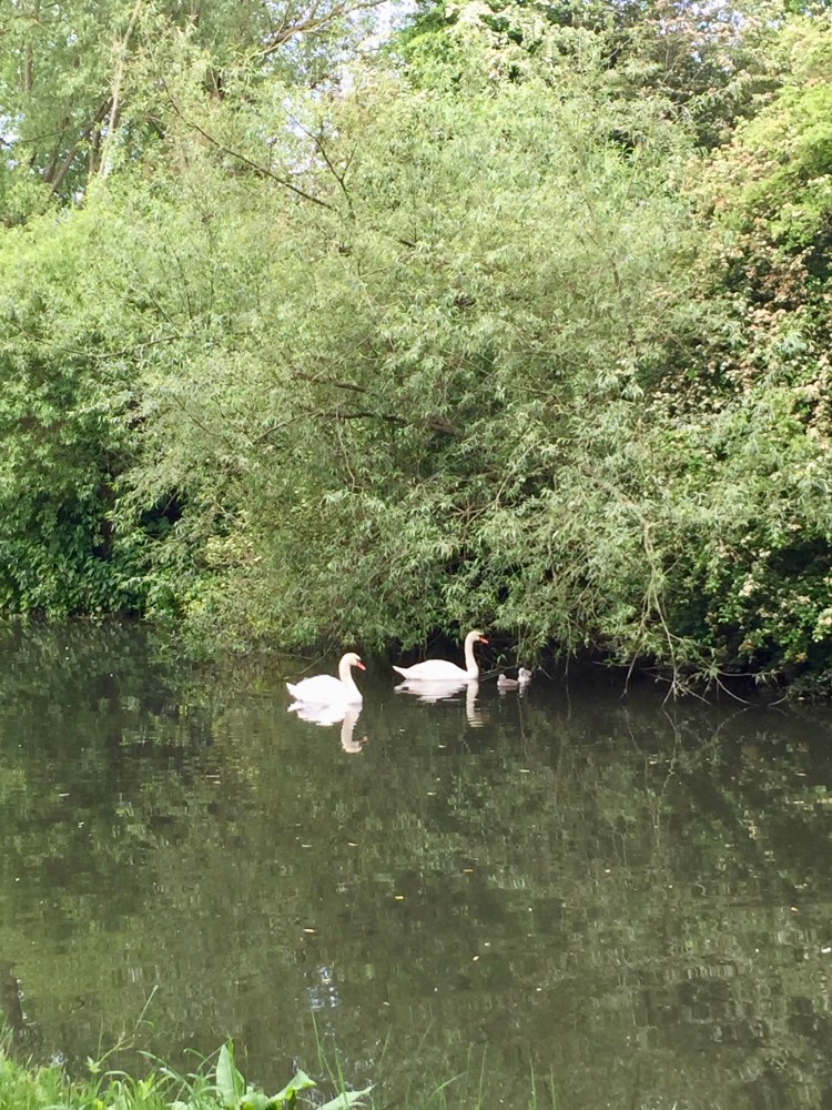 I’ve done some walking, too, along my favourite canal route and past the river, taking photos of green calm and reflection. The swans I saw nesting the other week now have cygnets, three little balls of grey fluff following their parents across the water.