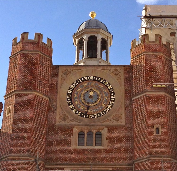This is the Fountain Court, designed by Sir Christopher Wren during the reign of William and Mary, when a huge program of renovation took place at the palace. William and Mary wanted the design to reflect their status as equal monarchs, so two sets of apartments, equal in size and stature, were designed, as well as two identical interior staircases. However, when Mary passed away, William lost interest in the renovation project and work ceased.With all this history, it’s not surprising that the palace is reputed to be haunted. Several tourists have reported strange occurences, and then there’s ‘Skeletor’, a famous image captured on the CCTV cameras which has not been adequately explained. We didn’t see any ghosts, but we did see a rather dishy fellow, a cross between Damien Lewis and Tom HIddleston, decked out in full Elizabethan regalia, including a single pearl drop earring. Seeing him on the train later in civilian clothes rather spoiled the illusion… 😀