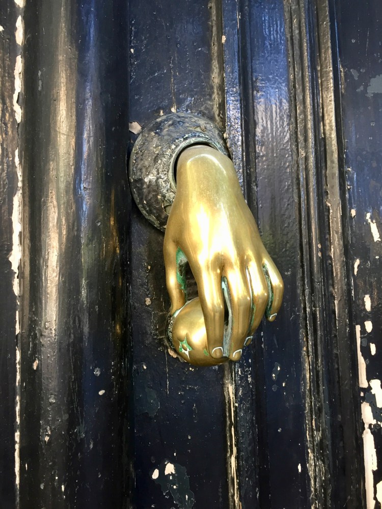The handle is straight from a dark fairy tale, a woman’s hand holding an apple. Is it the wicked queen, tempting unwary visitors to their fate, or Snow White herself, frozen by cold poison for eternity, her glass casket replaced by wood and stone, waiting for her prince to open the door?