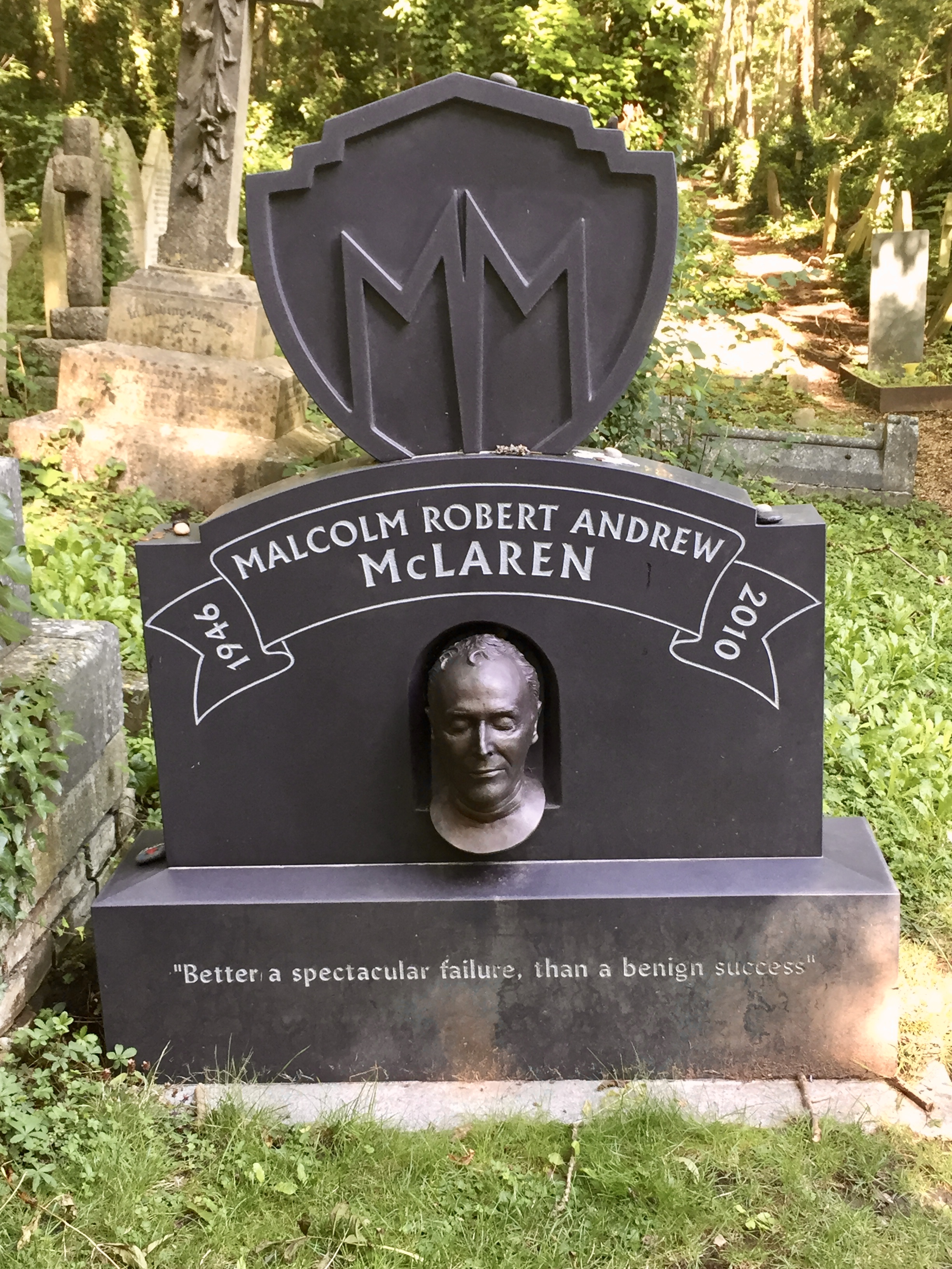 This is the grave of Malcolm MacLaren, which features his death mask for that extra little je-ne-sais-quoi.