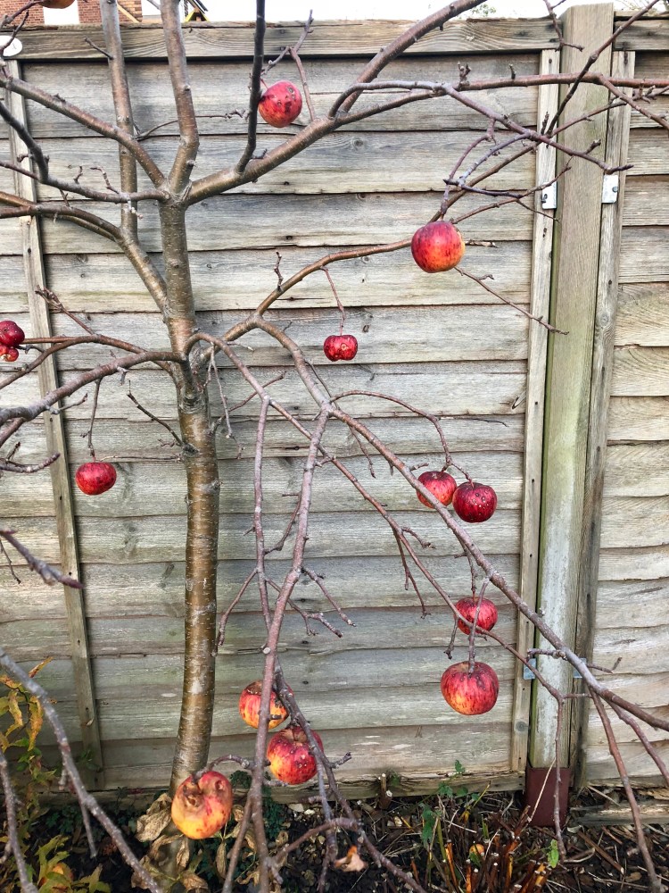 I haven’t even been able to get out for my usual walks – and I love this time of year. I love the way the sun slants low in the sky, the colours in the clouds and the trees, the last remnants of colour before the starkness of winter arrives. My apple tree still has a few forlorn apples left on it, and there are berries on the bushes – early Christmas decorations, perhaps?