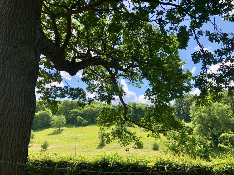 The grass was tall, starred with dandelions and buttercups, deep blue speedwell and pink campion, butterflies fluttering here and there. The trees were bursting with green, as though decorated to celebrate the turning of nature’s wheel, the blue sky festooned with clouds.