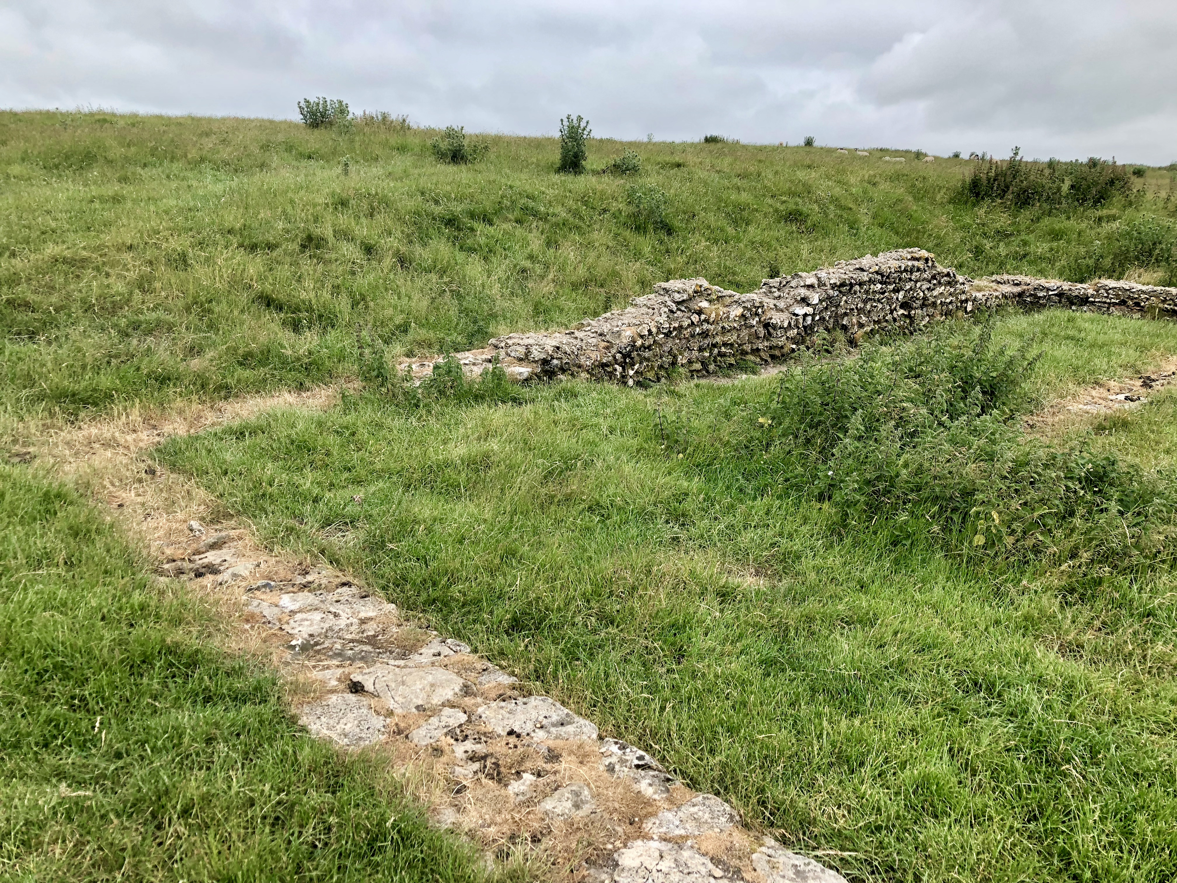 The Roman temple at Maiden Castle sits on what is thought to have been an earlier, pre-Christian temple on the site, as there is evidence it sits within the remains of a roundhouse. It actually consisted of several buildings, although only fragments of wall remain. Roman artefacts, including a hoard of coins, have been found in the temple and at other sites on the hilltop, suggesting that the Romans, while they may not have occupied the site, certainly made use of it.