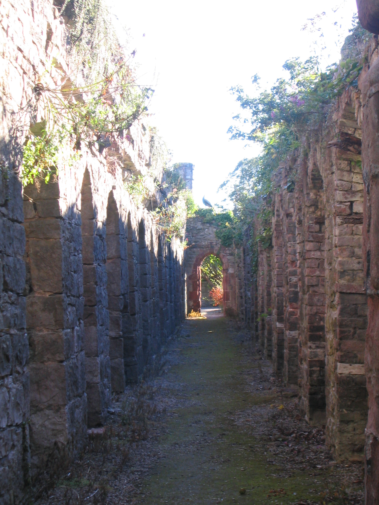 Then ensues a small chase, me with the pushchair, him with the camera as he follows the peacock along the ruined walls, surprised by the penchant of the British to keep such birds in the grounds of their stately homes.